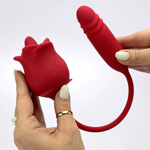Dual Bloom rose vibrator lathers you with 10 licking modes, 10 thrusting + 10 vibration functions, delivering 3x pleasure. Its soft, flexible silicone cord bends to your body, while the petal-like tongue teases your clit and the ribbed shaft thrusts deeply.